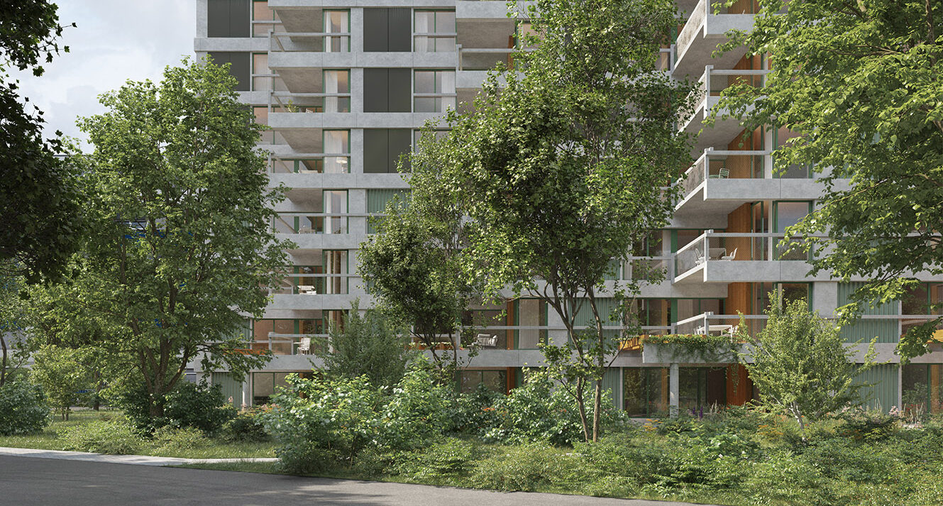 Dank des kleinen Fussabdrucks steht der Siedlung ein grosszügiger Aussenraum zur Verfügung. Die Umgebungsgestaltung mit vielen neuen Baumpflanzungen und unversiegelten Flächen knüpft an den «Inneren Garten Leutschenbach» an und leistet einen Beitrag zur lokalen Hitzeminderung. Die ressourcensparende Konstruktion und die Photovoltaik-Elemente auf den Dächern lassen eine gute Bilanz der Treibhausgasemissionen erwarten. Der Neubau soll nach dem Minergie-P-ECO-Standard erstellt werden. Beheizt wird die künftige Wohnsiedlung über das Fernwärmenetz von ERZ.