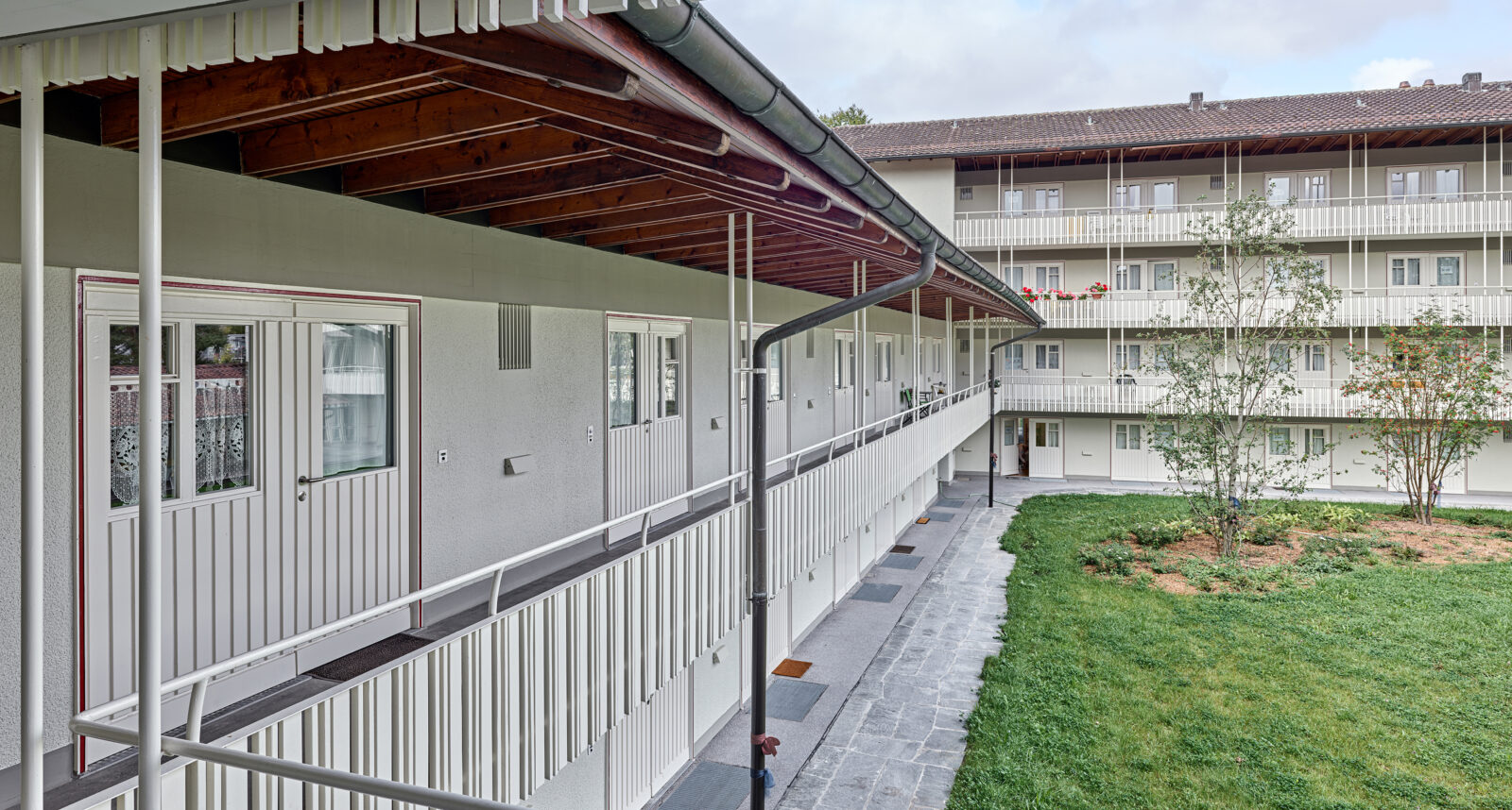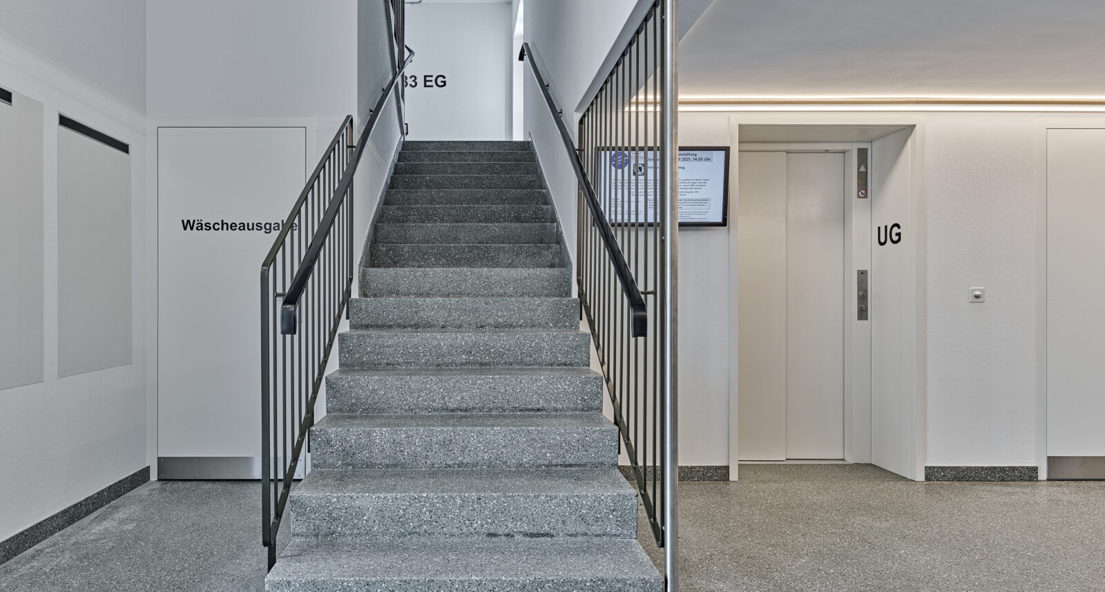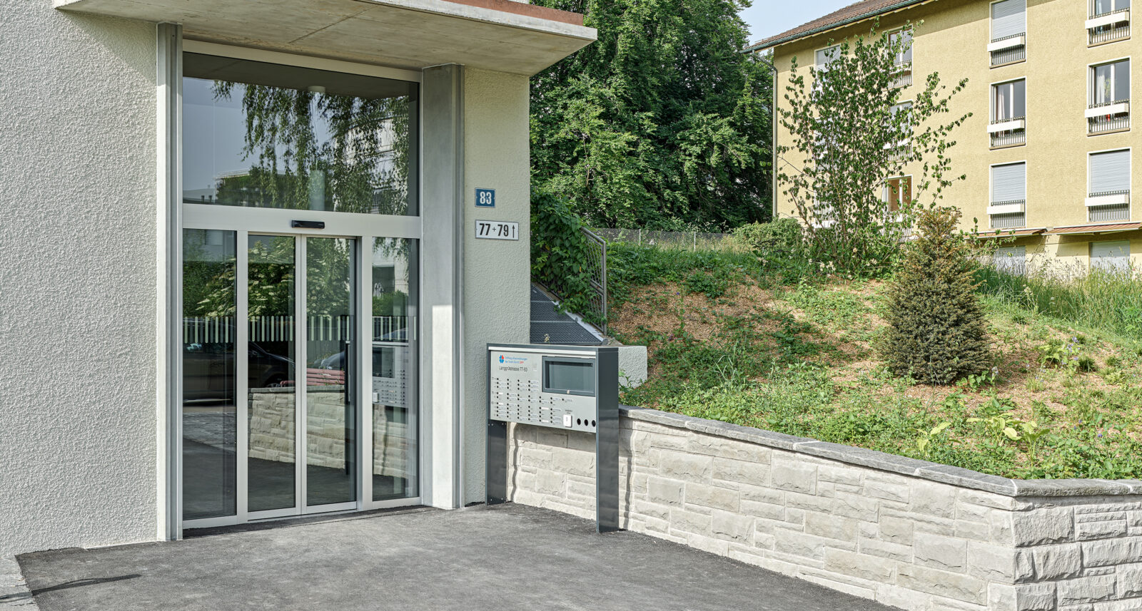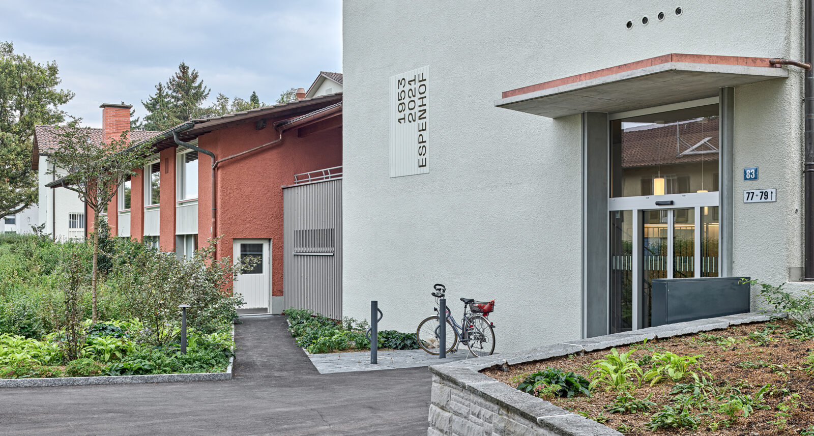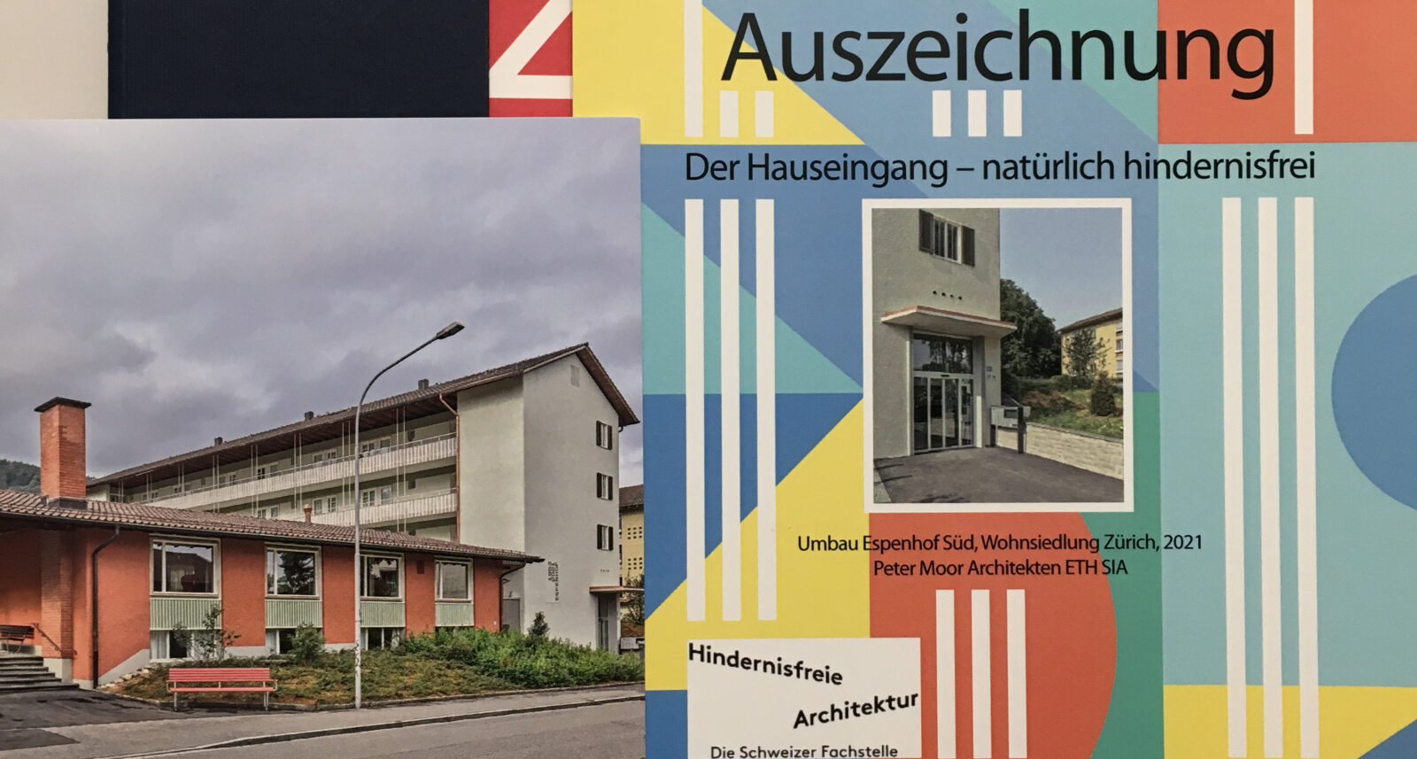 weiterlesenGeradezu mustergültig setzte das Projekt von Peter Moor Architekten die Intention des Wettbewerbs um. Der Umbau des Eingangs der Wohnsiedlung Espenhof in Zürich Albisrieden wurde erst in diesem Jahr fertiggestellt und besticht mit einem Hauseingang als «Adresse für alle». Denn der ehemalige Strassenzugang war im Lauf der Jahre zum schmuddeligen Hintereingang geworden. Um nicht nur die Hindernisfreiheit zu gewährleisten, sondern den Zugang auch leichter auffindbar zu gestalten – denn dies ist ein sehr wichtiger Aspekt für Menschen mit Behinderung – verlegten die Architekt*innen bei der Sanierung der Anlage den Haupteingang wieder (zurück) an die Strasse. Der neue Eingang mit Vordach und Schiebetür integriert sich heute gut in den 1950er-Jahre-Stil des Gebäudes. In dem sich anschliessenden Foyer wurde nicht nur Bewegungsfläche für Rollstuhlfahrende, sondern auch viel Raum für Begegnungen geschaffen. Mit seiner Überhöhe ist es eine prominente Eingangsgeste für alle. Die Ausführung wurde sehr sorgfältig und präzise umgesetzt. Die Gegensprechanlage funktioniert nach dem Zwei-Sinnen-Prinzip. Und – vom Foyer aus erreichen die Bewohner*innen nun via einem neuen grosszügigem Lift die 53 Wohnungen in den oberen Geschossen. Eine insgesamt gelungene Aufwertung im Sinn des «Design for all», welche die Siedlung wieder klar im Stadtgefüge verortet.